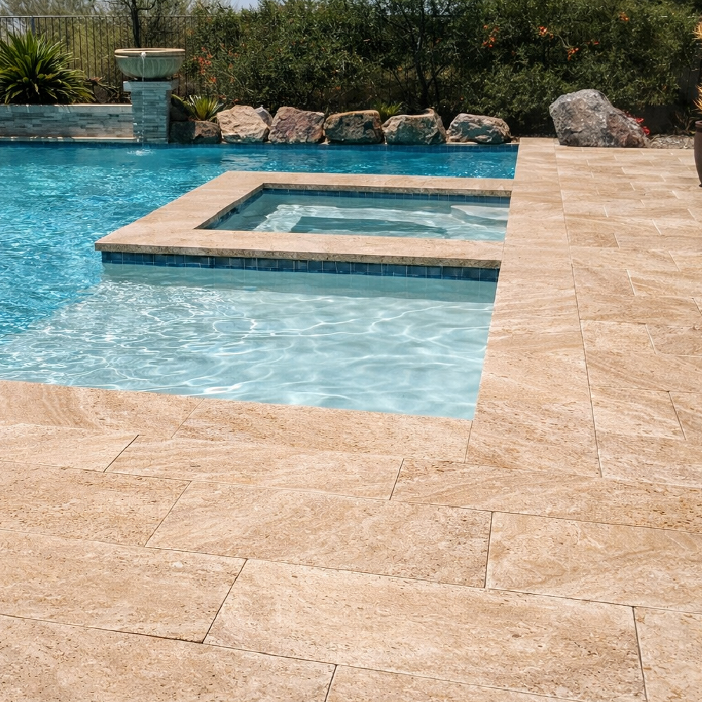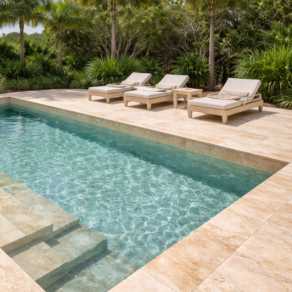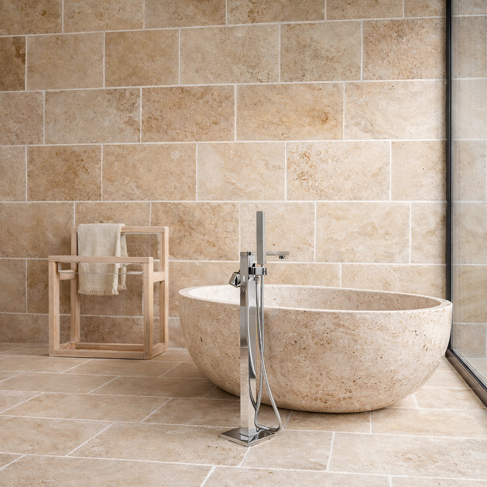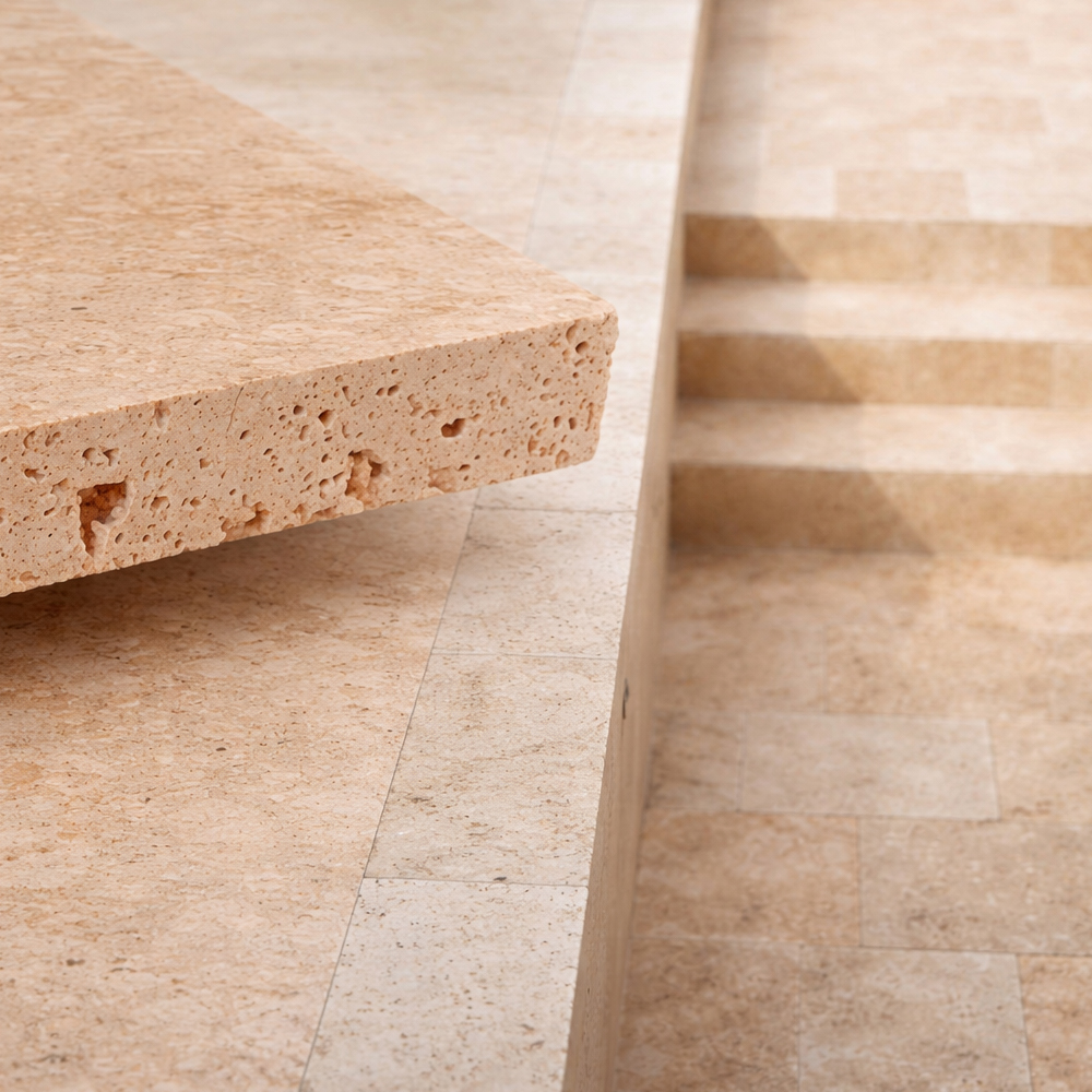 Estéticamente, el travertino transmite calidez, elegancia y naturalidad. Sus tonos suaves —beige, crema y arena— generan ambientes luminosos y sofisticados. Cada pieza es única, con vetas y cavidades que le dan identidad propia, logrando espacios con carácter, lujo y una conexión directa con la naturaleza.