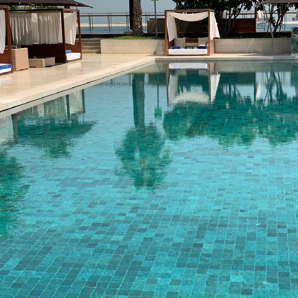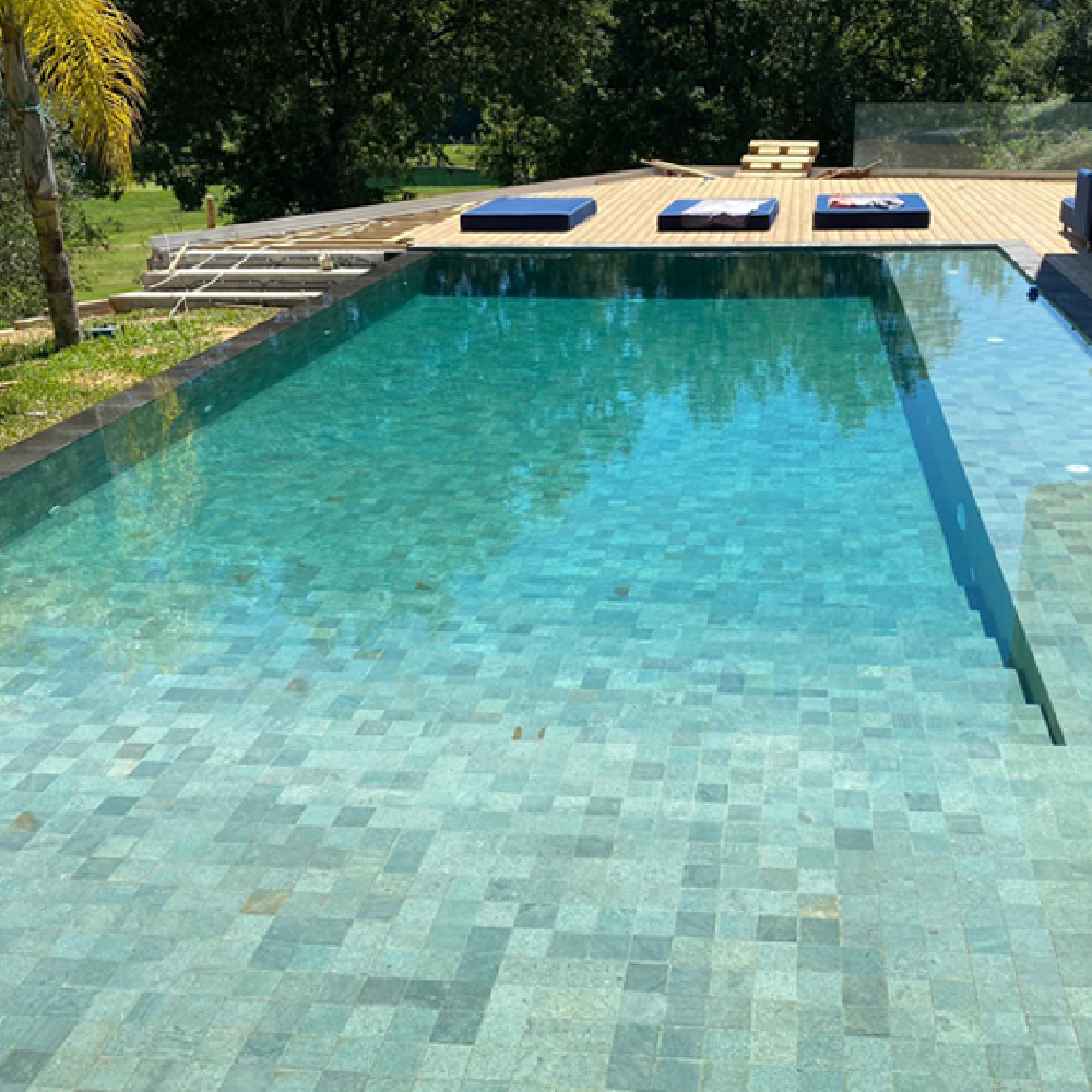 Estéticamente es un producto muy llamativo ya que cuando se moja cambia su color, reflejando un color verde esmeralda intenso y espectacular. Se seca rápidamente tomando su color original. Las sensaciones y efectos visuales que crean son únicos, por lo que resaltarán tu pileta y la llevarán a otro nivel.
